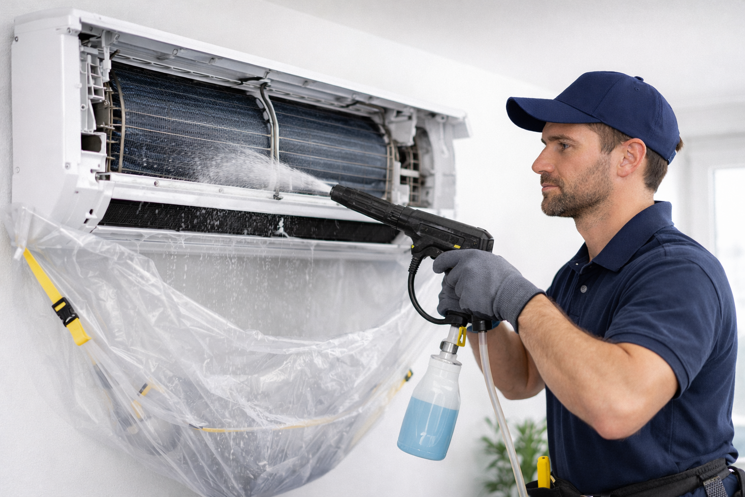 Désinfection des unités intérieures et extérieures à l’aide de produits biocides professionnels conformes à la réglementation en vigueur.